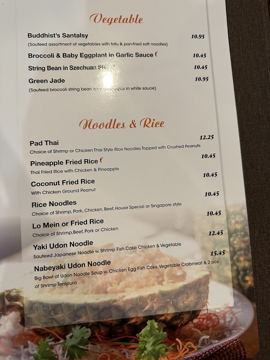 Choice of shrimp or chicken Thai style rice noodles tipped with crushed peanuts.