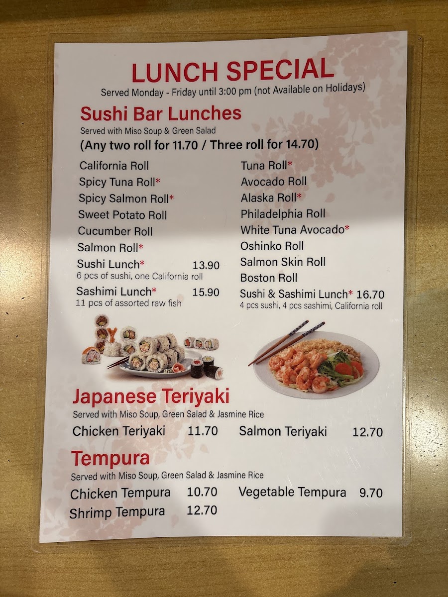 Served with miso soup and salad. One tuna roll, four pieces sushi, and ten pieces sashimi.