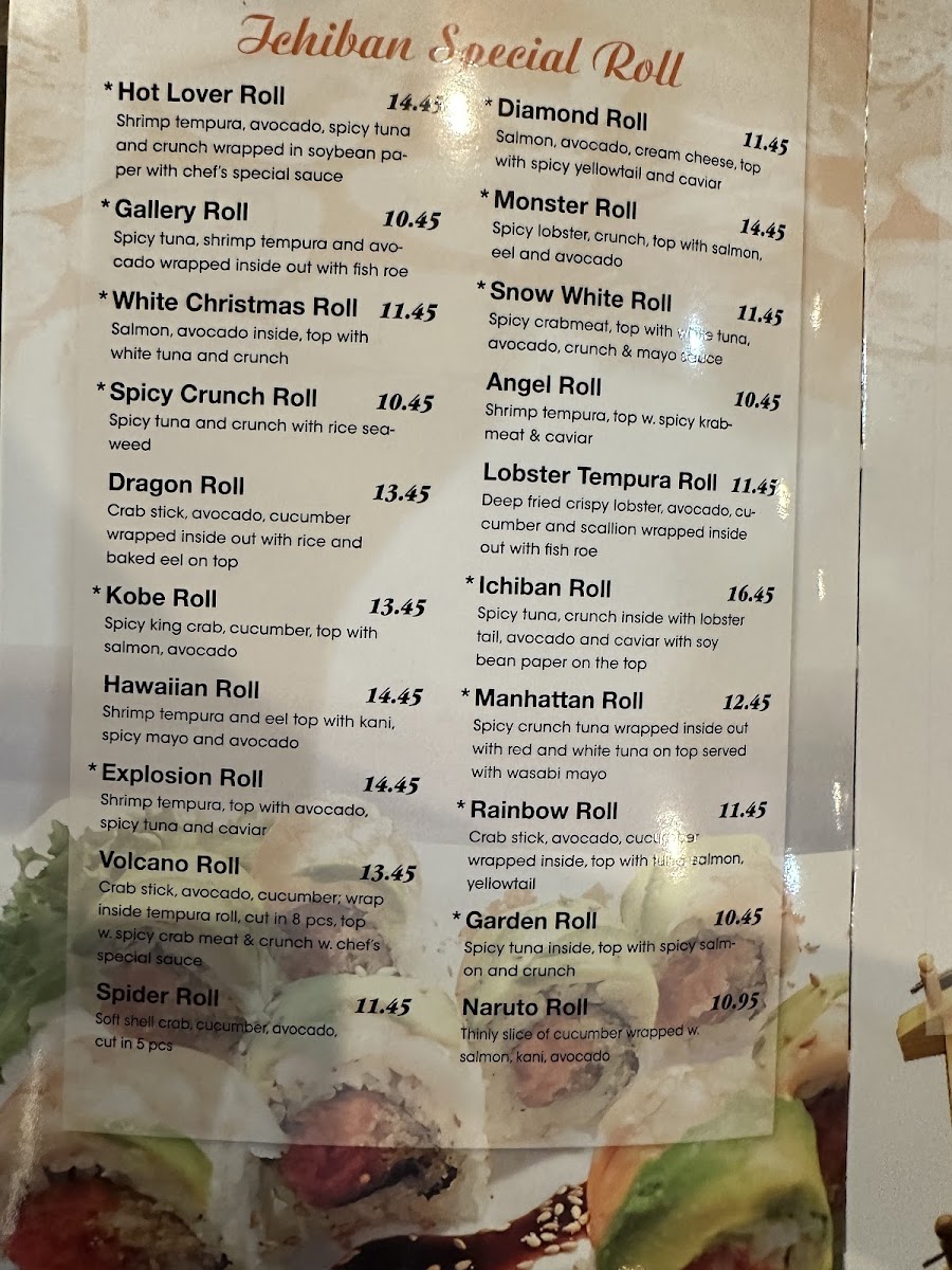 The menu at Ichiban Sushi Asian Bistro offers a diverse range of flavorful dishes that cater to various tastes. For sushi lovers, options like Tuna (Maguro), Squid, and Shrimp (Ebi) are available in the Sushi & Sashimi A La Carte section, with prices varying based on the selection. Teriyaki fans can enjoy dishes like Chicken Teriyaki and Salmon Teriyaki, while those craving rolls can indulge in the Alaska Roll and Spicy Salmon Roll. Cold appetizers such as Sunomono and Sashimi Appetizer (6) are great starters, while the Hot Appetizers section features favorites like Crispy Calamari and Shumai. For those seeking heartier fare, the Japanese Entrées include choices like Tempura Deluxe and Chicken Katsu, while the Pad Thai and Yaki Udon Noodles offer a delicious twist on noodles. The menu also features a variety of Chef’s Specialties, including the Seafood Casserole and Grilled Salmon Fillet. Additionally, patrons can enjoy an array of beverages such as Ramune and Thai Iced Tea With Boba. With a mix of traditional sushi, flavorful rolls, and diverse entrees, Ichiban Sushi Asian Bistro offers a satisfying dining experience for all guests.