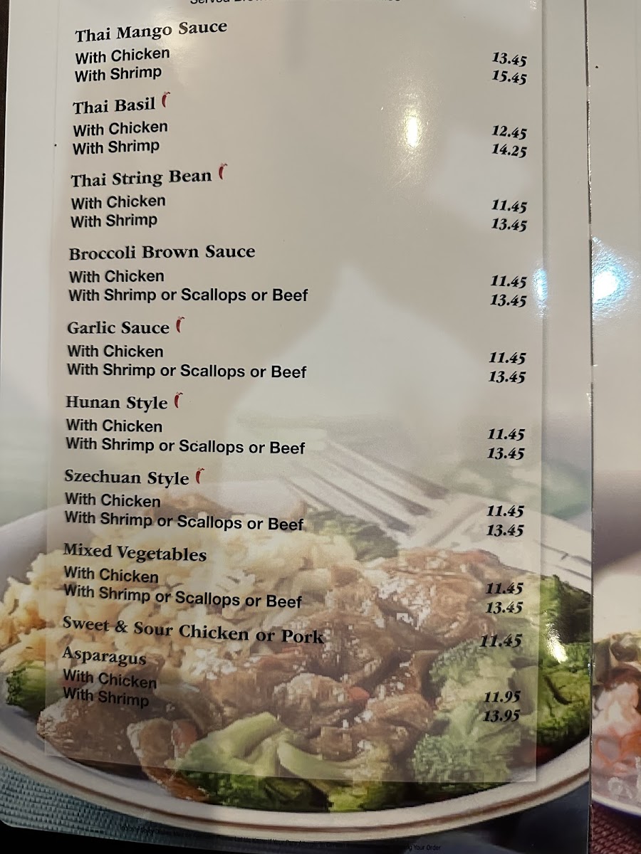 Spicy. Mango, bell pepper, basil, onion, and snow peas. Served brown rice or jasmine rice.